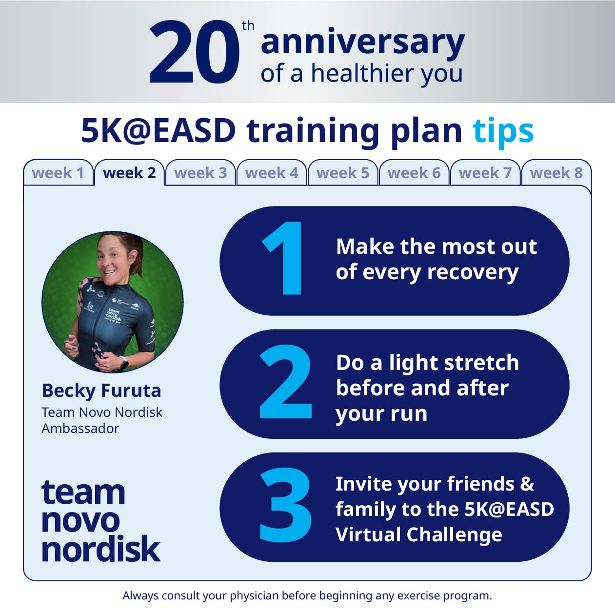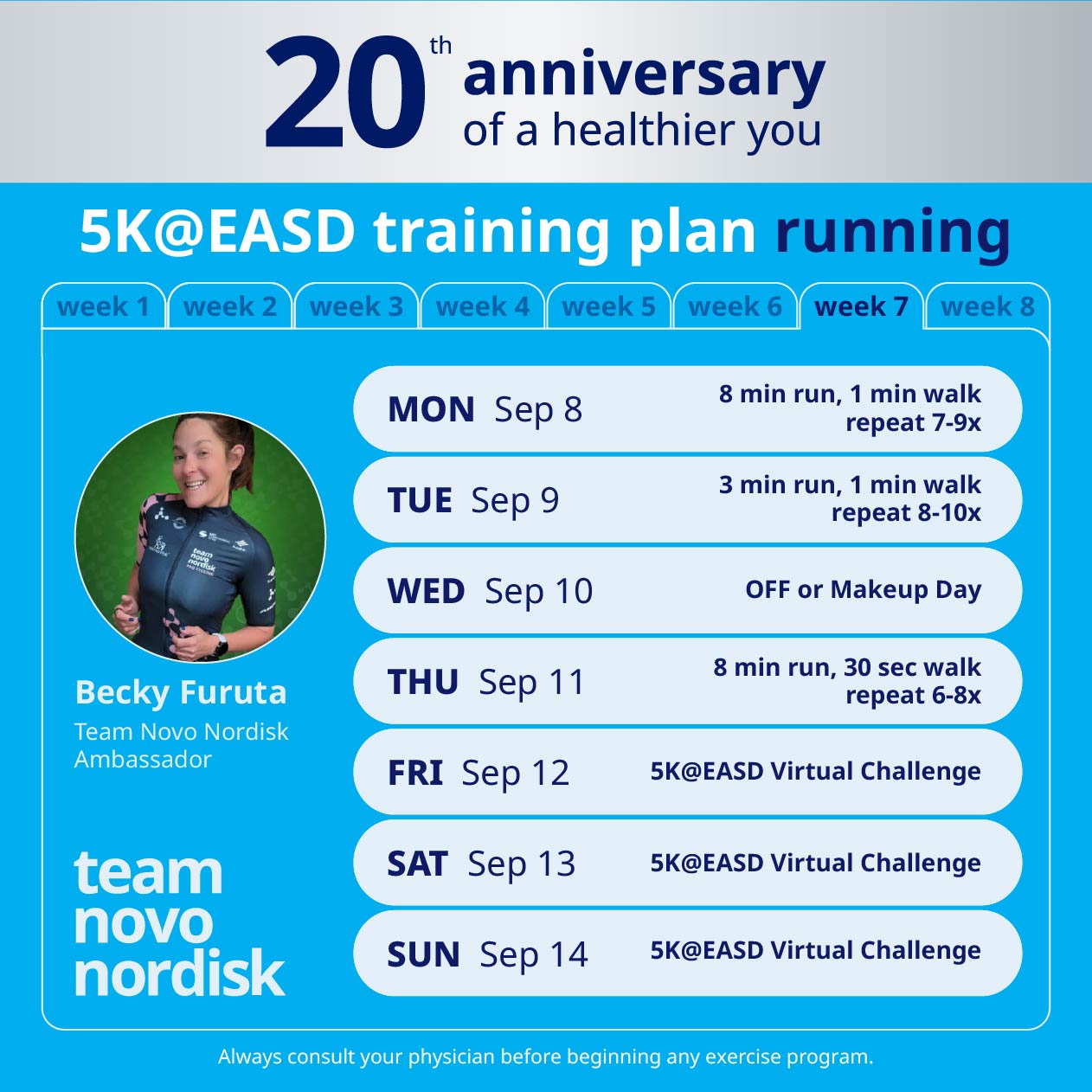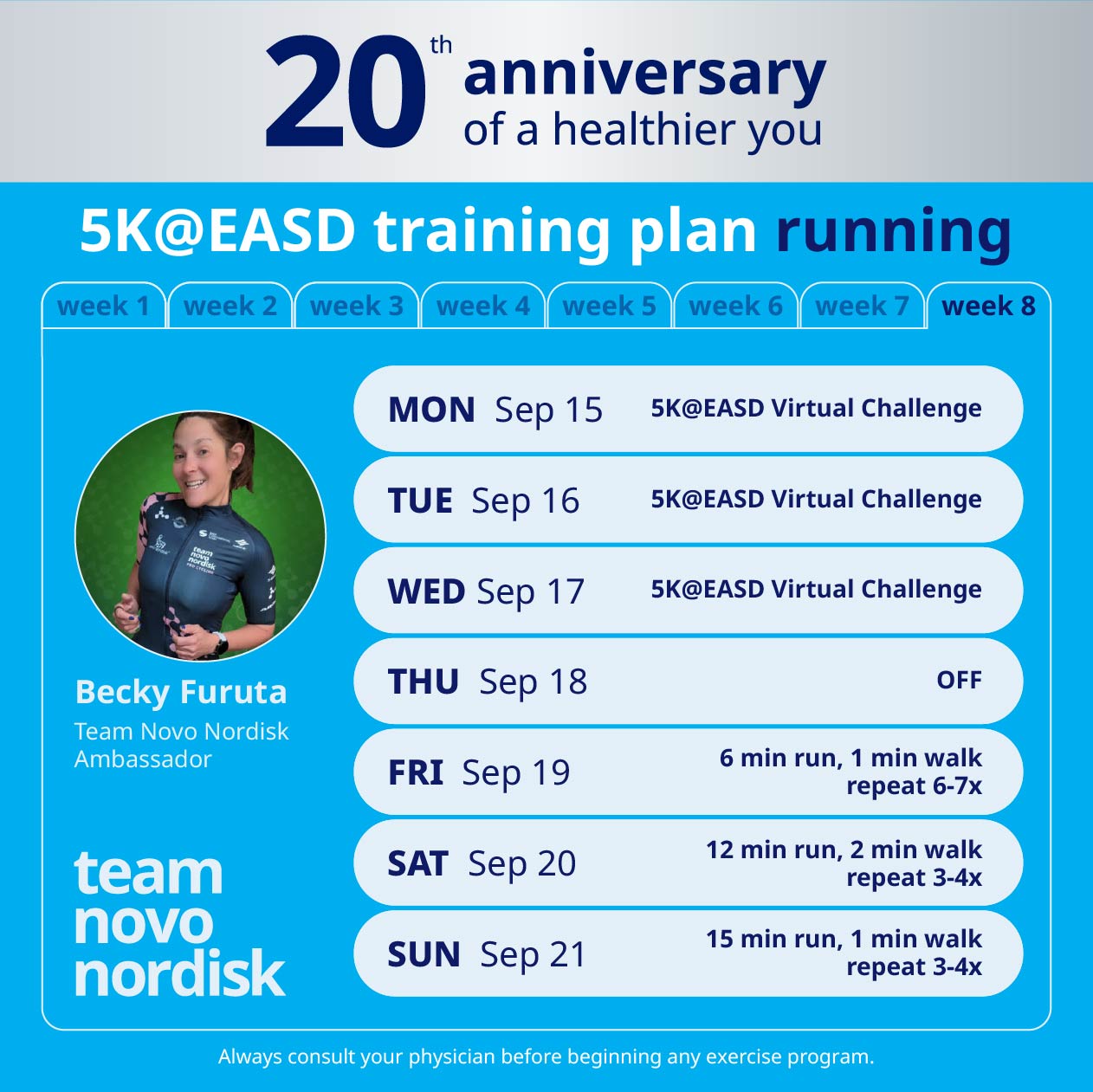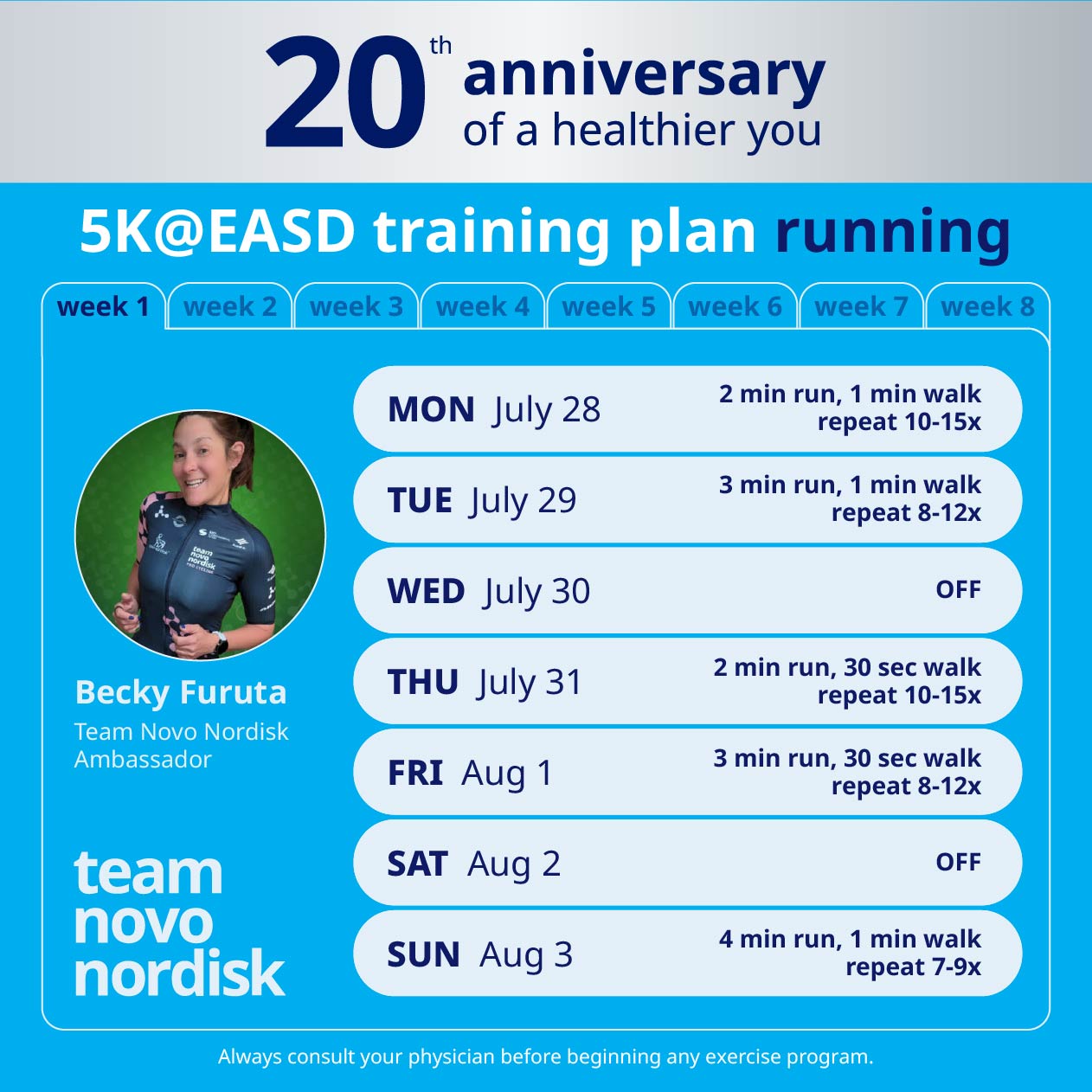 Take the first step with support from Team Novo Nordisk's FREE 8-week 5K training plans to help you get ready for the 5K@EASD Virtual Challenge.