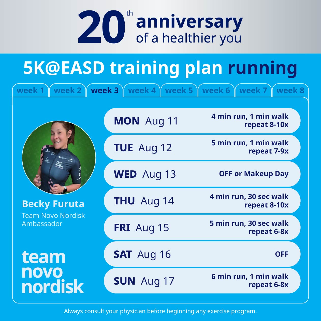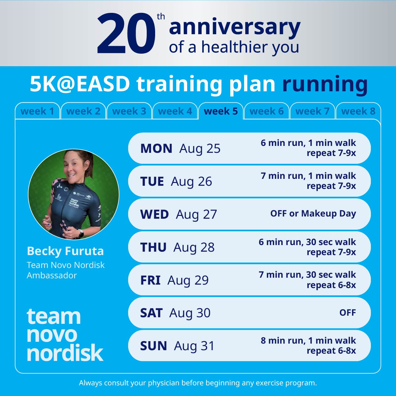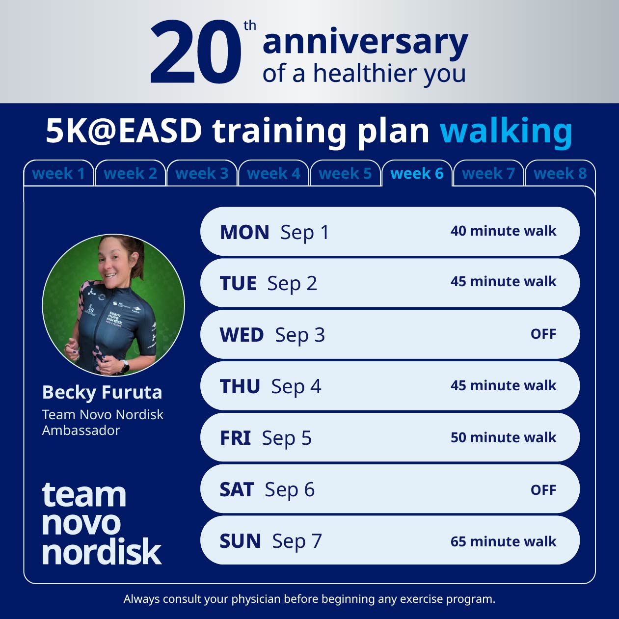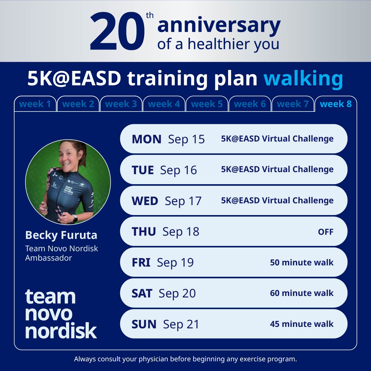 Take the first step with support from Team Novo Nordisk's FREE 8-week 5K training plans to help you get ready for the 5K@EASD Virtual Challenge.