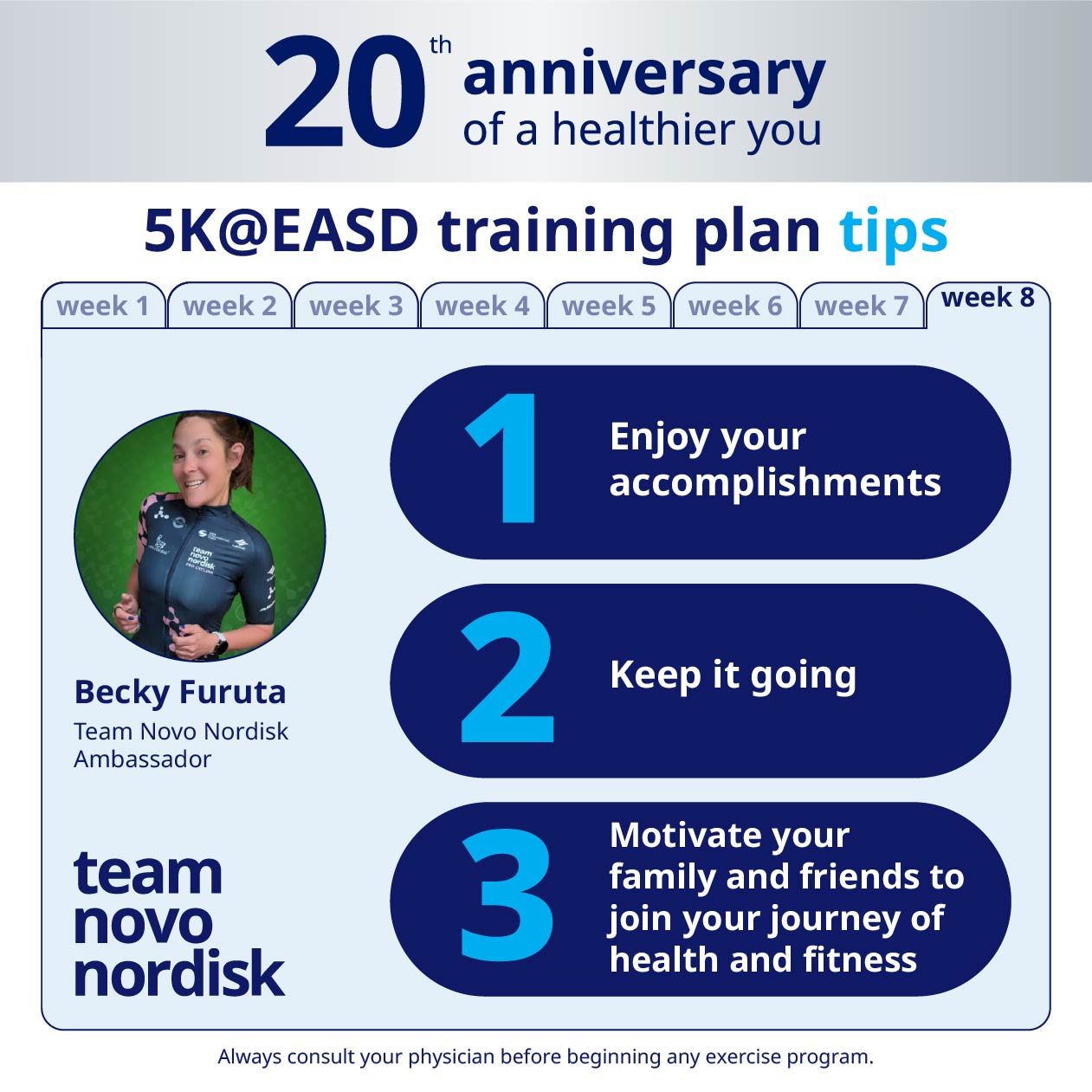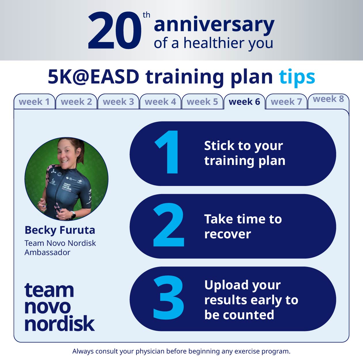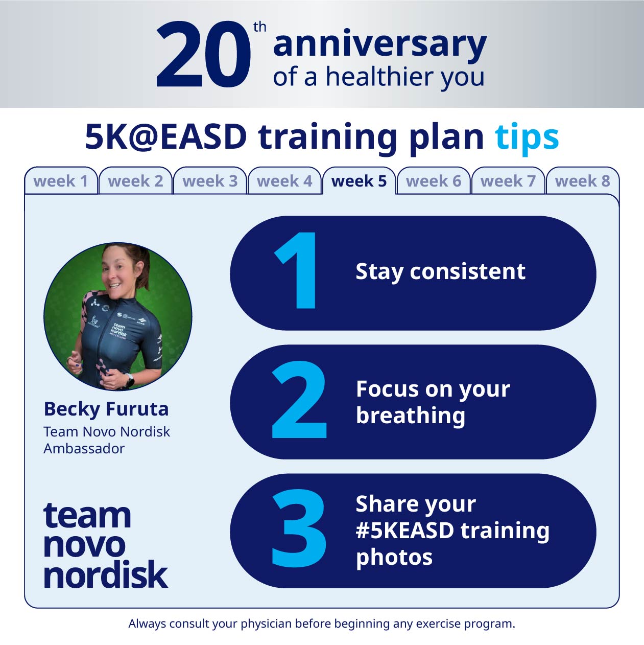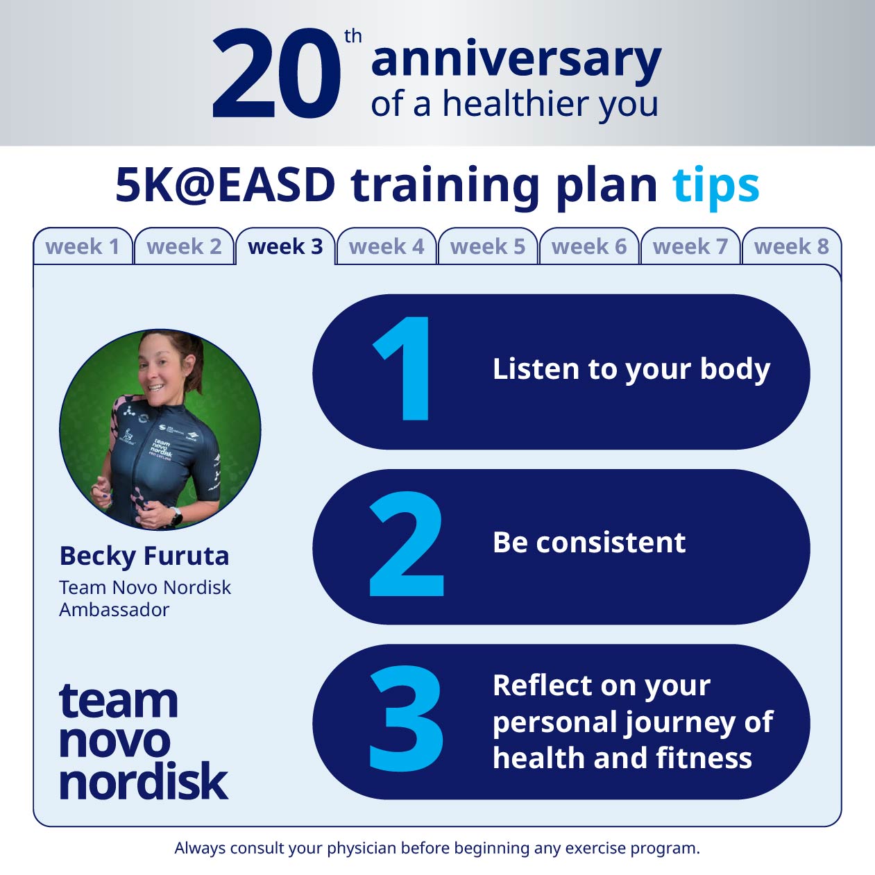 Take the first step with support from Team Novo Nordisk's FREE 8-week 5K training plans to help you get ready for the 5K@EASD Virtual Challenge.